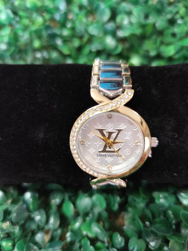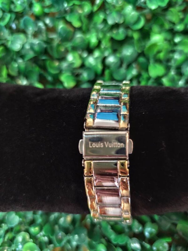 Reloj inspiración Louis Vuitton con correa plateada y dorada.